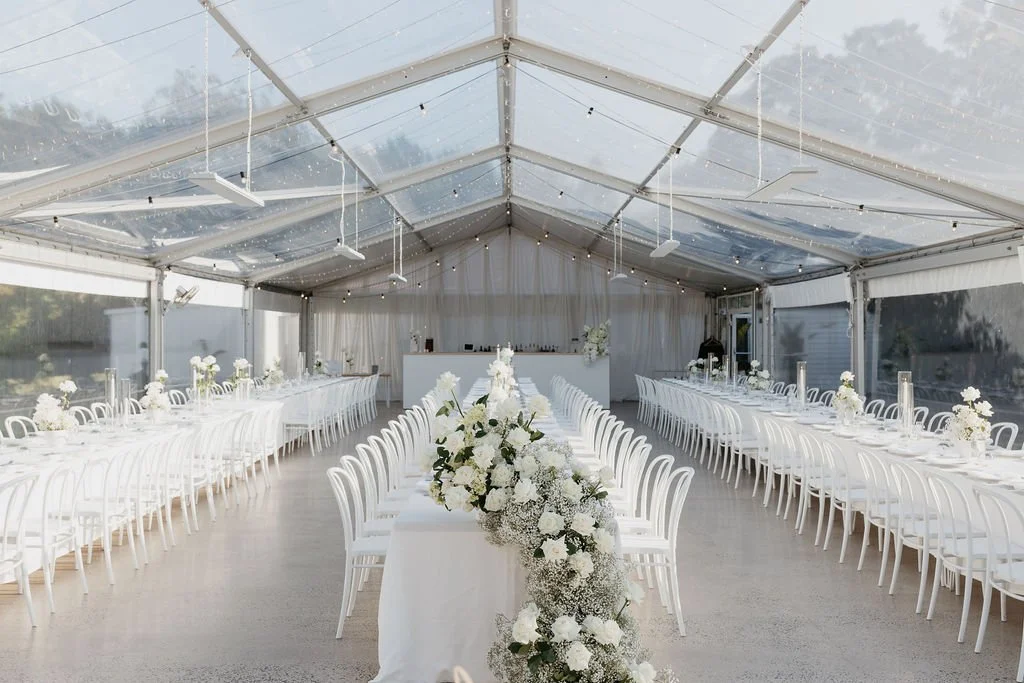 Clear-view marquee, tables and chairs all set ready for to use and make it yours - photo by @morganleephotography_